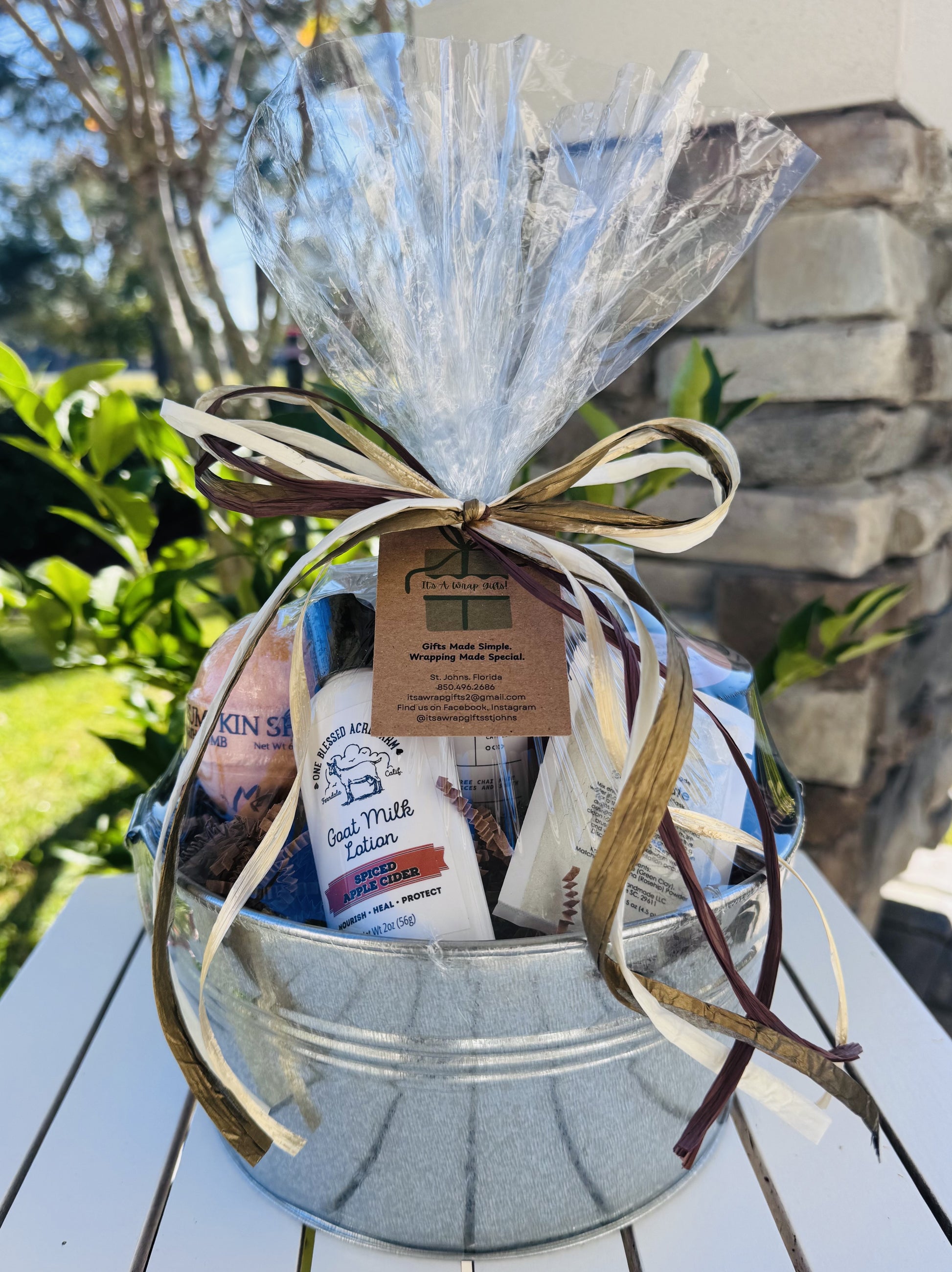 Gift Basket is topped with a Raffia bow in a variety of Holiday colors. All of our gift baskets are handmade utilizing a variety of the scents listed above!