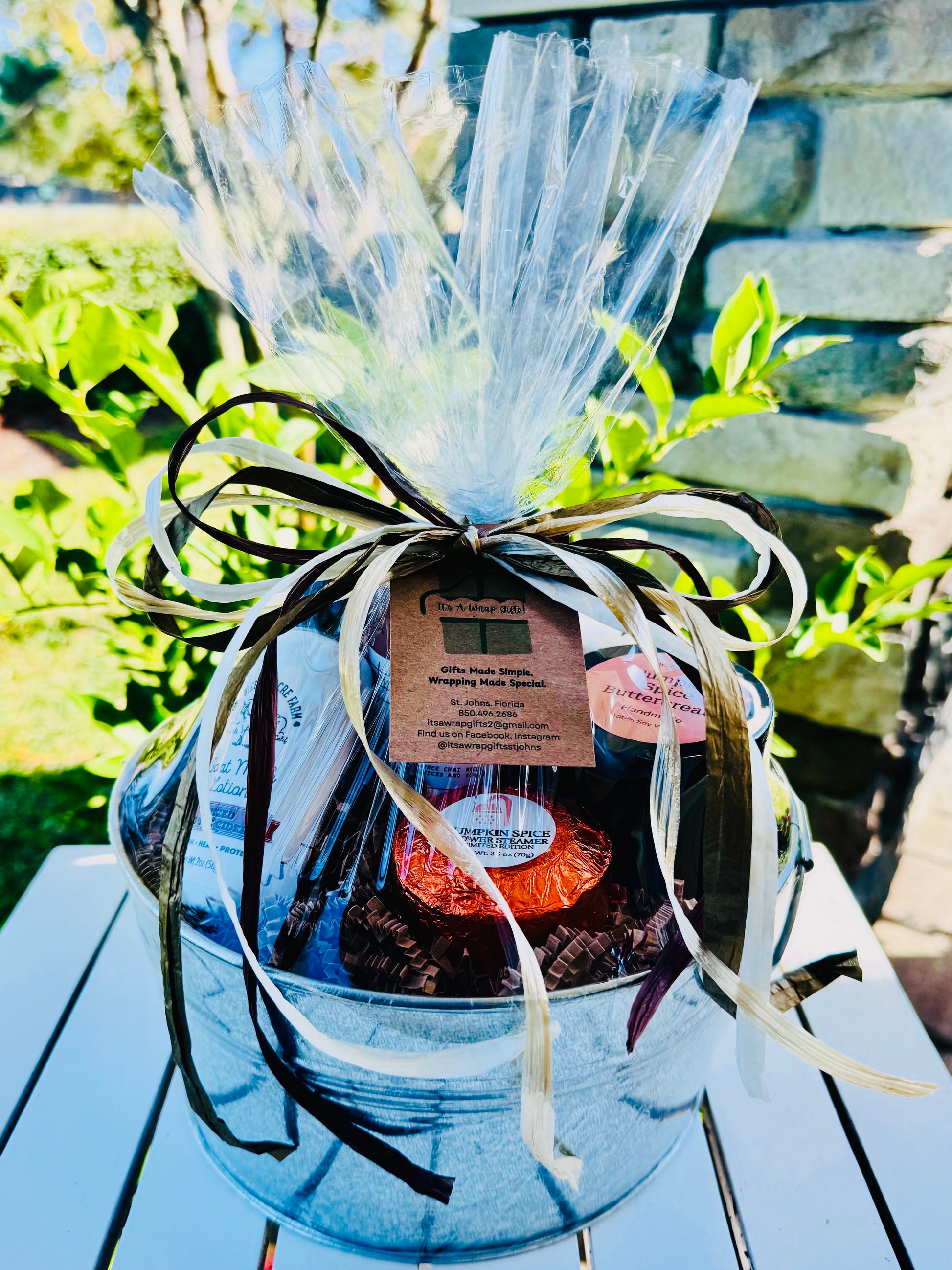 Gift Basket is topped with a Raffia bow in a variety of Holiday colors. All of our gift baskets are handmade utilizing a variety of the scents listed above!